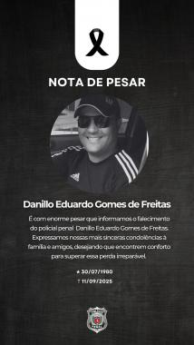 14:28 NOTA DE FALECIMENTO - DANILLO EDUARDO GOMES DE FREITAS É com enorme pesar que a Polícia Penal do Paraná (PPPR) informa o falecimento do policial penal Danillo Eduardo Gomes de Freitas, aos 45 anos, ocorrido na data de hoje (11).