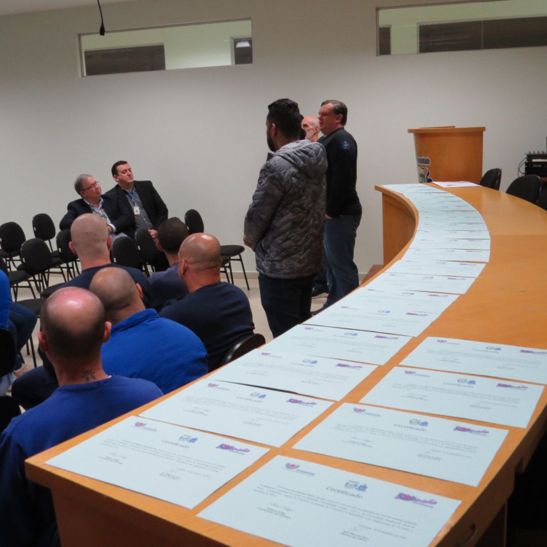 A cerimônia contou com a participação do coordenador regional da Polícia Penal, em Cascavel, Thiago Correia, do diretor da Penitenciária Industrial Marcelo Pinheiro, Álvaro Alegrette, do professor da Unioeste e coordenador do projeto Educar para o Futuro, Valdecir Soligo, do coordenador do curso de pedagogia da Unioeste, Marco Antônio, do presidente do Conselho da Comunidade de Cascavel, Rosaldo Chemim, da professora responsável por ministrar o curso, Rosane Ciszevski Lenz e dos familiares das pessoas privadas de liberdade (PPLs).
