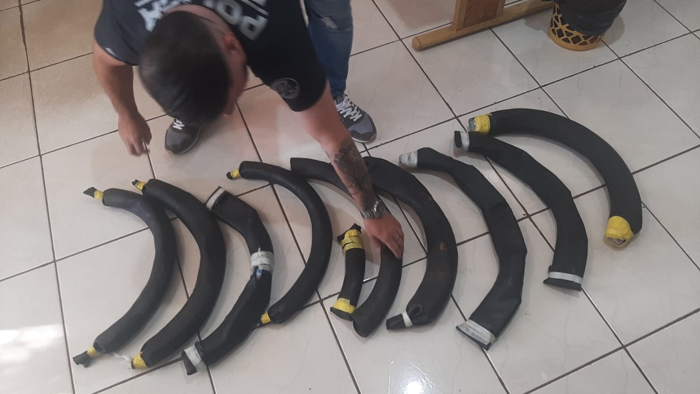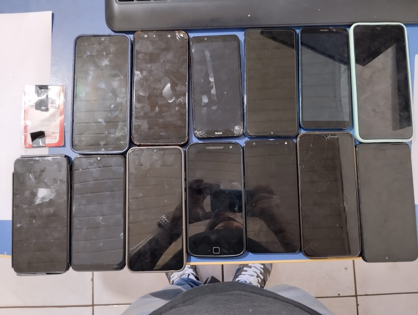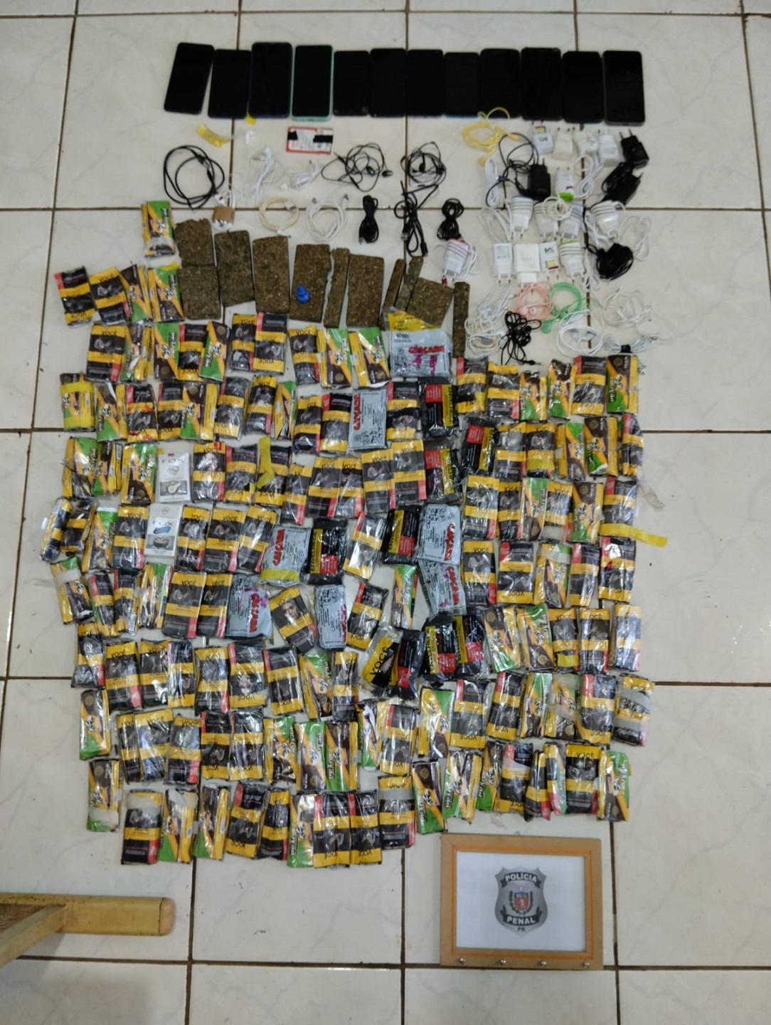O adolescente foi abordado e com ele foram apreendidos 13 aparelhos celulares, 18 carregadores, cabos USB, 13 fones de ouvido, um chip de celular, 141 pacotes de substância análoga ao fumo, duas carteiras de cigarro, dois isqueiros e 970 gramas de substância análoga à maconha.