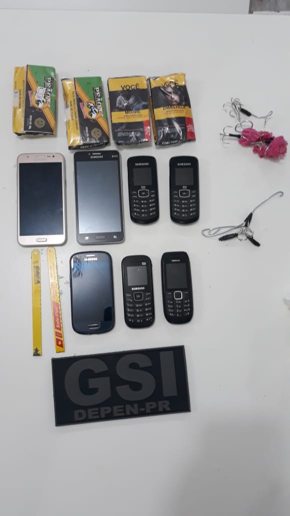Agentes penitenciários apreenderam um kit cadeia que foi arremessado na Penitenciária Estadual de Cascavel (PEC) na noite desta quinta-feira (18/06). No pacote estavam sete aparelhos celulares, dois pedaços de serra e quatro pacotes de fumo. A ação ocorreu após um servidor do setor de monitoramento eletrônico perceber a presença do embrulho por meio de imagens de câmeras de segurança.