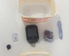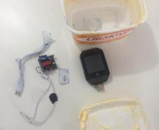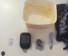 Agentes penitenciários do Departamento Penitenciário do Paraná (Depen) lotados na Cadeia Pública de Matelândia, na região oeste do estado, apreenderam um smartwatch (relógio celular) durante procedimentos de revista de entrada, na segunda-feira (10/02). Além do aparelho, ainda foram encontrados um chip de celular e carregadores. Os eletrônicos estavam escondidos escondidos em um pote de margarina com fundo falso.