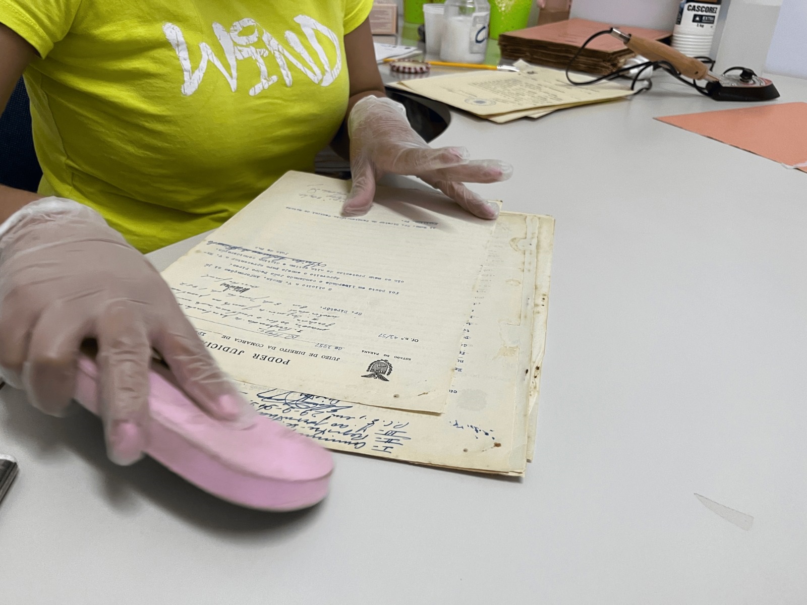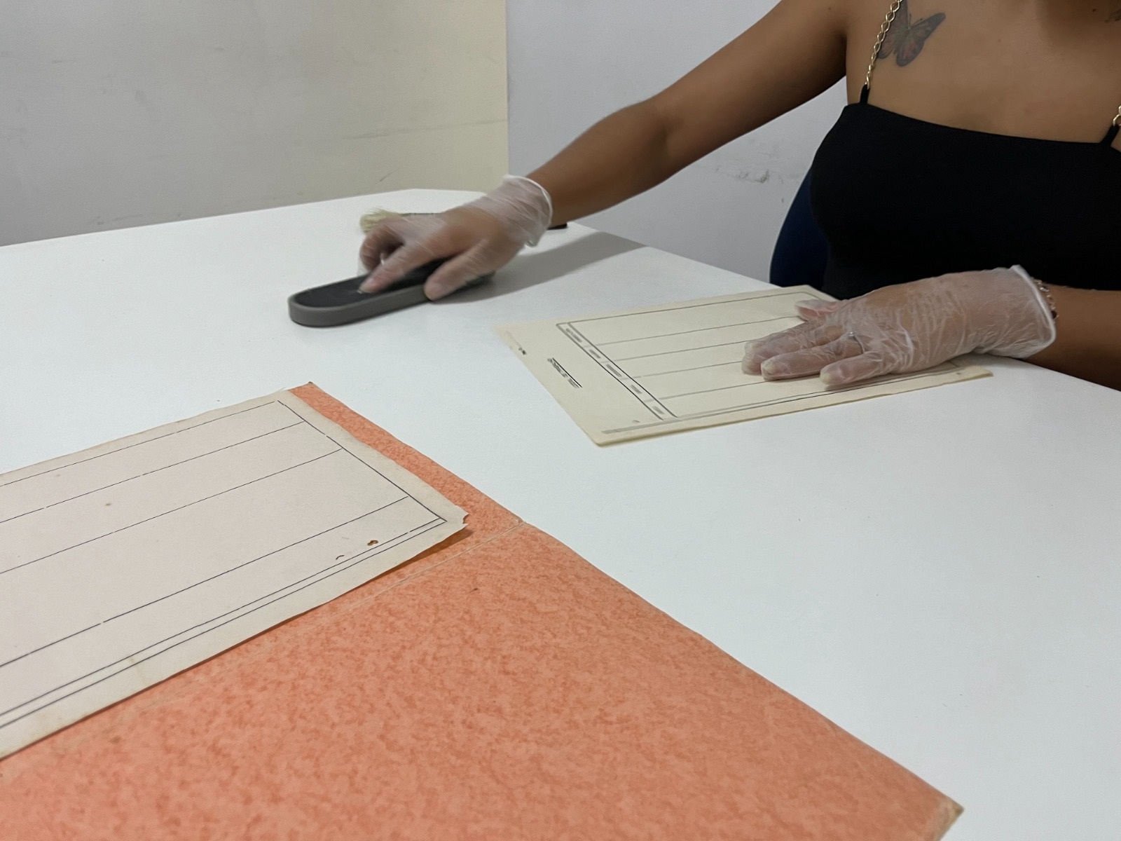 O uso de máscara e luvas descartáveis é obrigatório em todas as etapas do processo para a proteção da restauradora e para que se evite danificar ainda mais o documento.