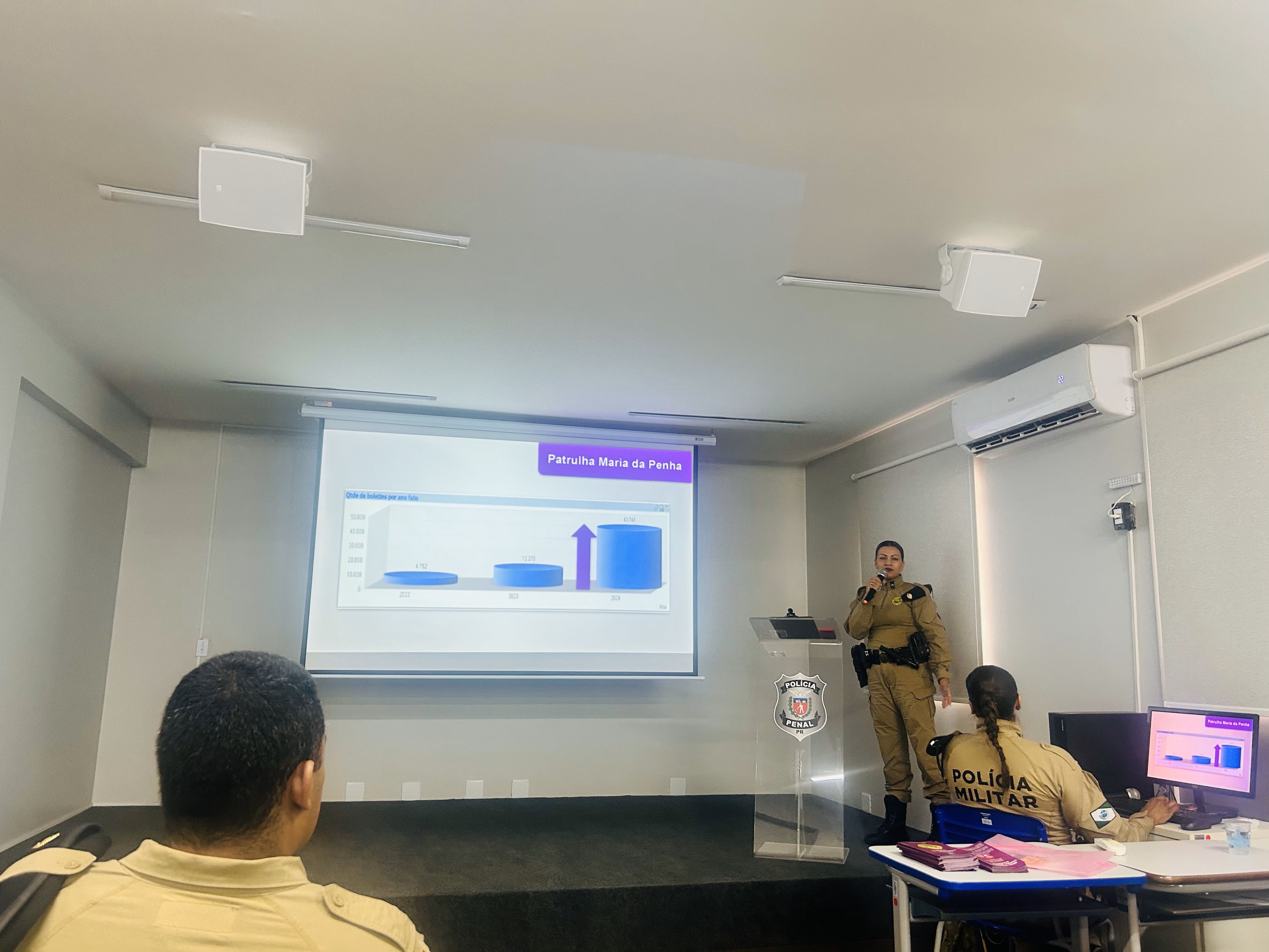 O auditório da Colônia Penal Industrial de Maringá (CPIM) recebeu uma palestra educativa sobre o combate à violência contra a mulher, na última quinta-feira (28). A iniciativa, promovida pela Patrulha Maria da Penha, por meio do Programa Mulher Segura da Secretaria da Segurança Pública do Paraná, reuniu servidores administrativos, policiais penais do Complexo Penitenciário de Maringá e policiais militares das cidades de Maringá e Sarandi.