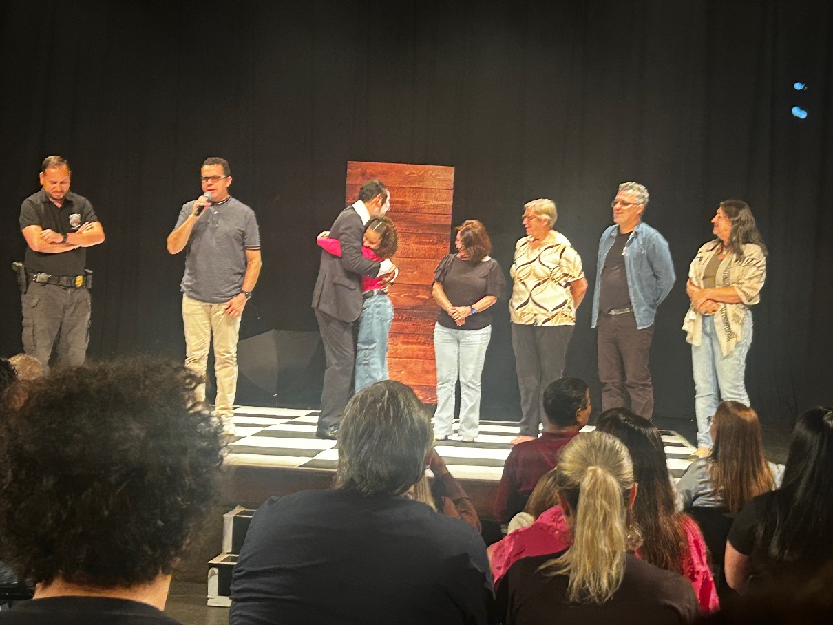 Arte como projeto de ressocialização - Pessoas que não têm relação direta com a Polícia Penal, também aderiram ao projeto como voluntárias, como é o caso do designer Lucas Nunes, que fez todo o trabalho de identificação visual, a pequena Laura, que emprestou sua voz como consciência do protagonista, interpretado por seu avô, e o servidor municipal Luiz Carlos Locatelli, que usou sua experiência na iluminação de espetáculos de teatro, dança e shows em geral, para criar e executar a iluminação do trabalho nascido em uma penitenciária.