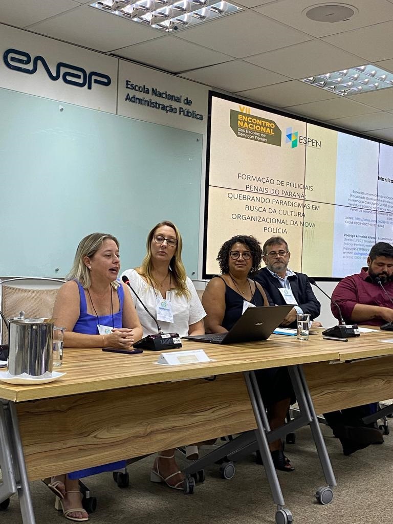 Durante o evento, promovido nas instalações da Escola Nacional de Administração Pública (ENAP), a direção-geral e coordenação pedagógica da Escola de Formação e Aperfeiçoamento Penitenciário (ESPEN) da Polícia Penal do Paraná (PPPR), apresentou ações relacionadas à formação e transição de policiais penais no estado.
