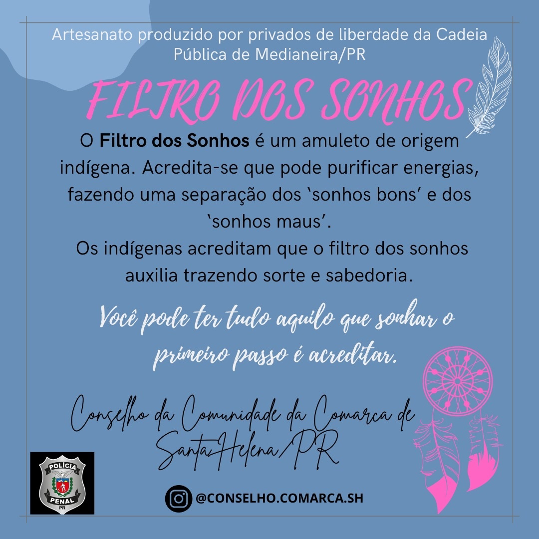 A Cadeia Pública de Medianeira, administrada pela Polícia Penal do Paraná (PPPR), segue realizando atividades em parceria com os demais órgãos da execução penal. O Projeto “Do Sonho à Liberdade” é uma dessas iniciativas. Desta vez, a atividade foi desenvolvida em conjunto com o Conselho da Comunidade de Santa Helena, município vizinho, distante 64 km de Medianeira, que forneceu os recursos para a confecção dos chamados “filtros dos sonhos”, que serão utilizados pelo Conselho em campanha comemorativa ao Dia Internacional da Mulher.