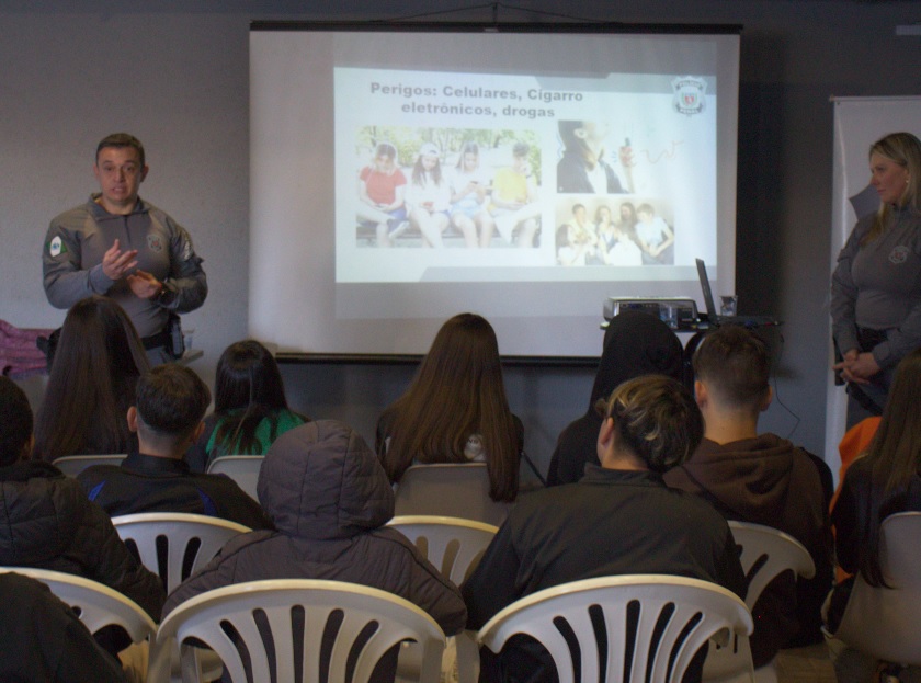 Foram discutidos os prejuízos à vida pessoal, familiar e comunitária que decorrem do envolvimento com o crime, com ênfase na importância do estudo, da construção de projetos de vida saudáveis e da escolha consciente de se manter afastado do consumo e da venda de drogas e ilícitas.