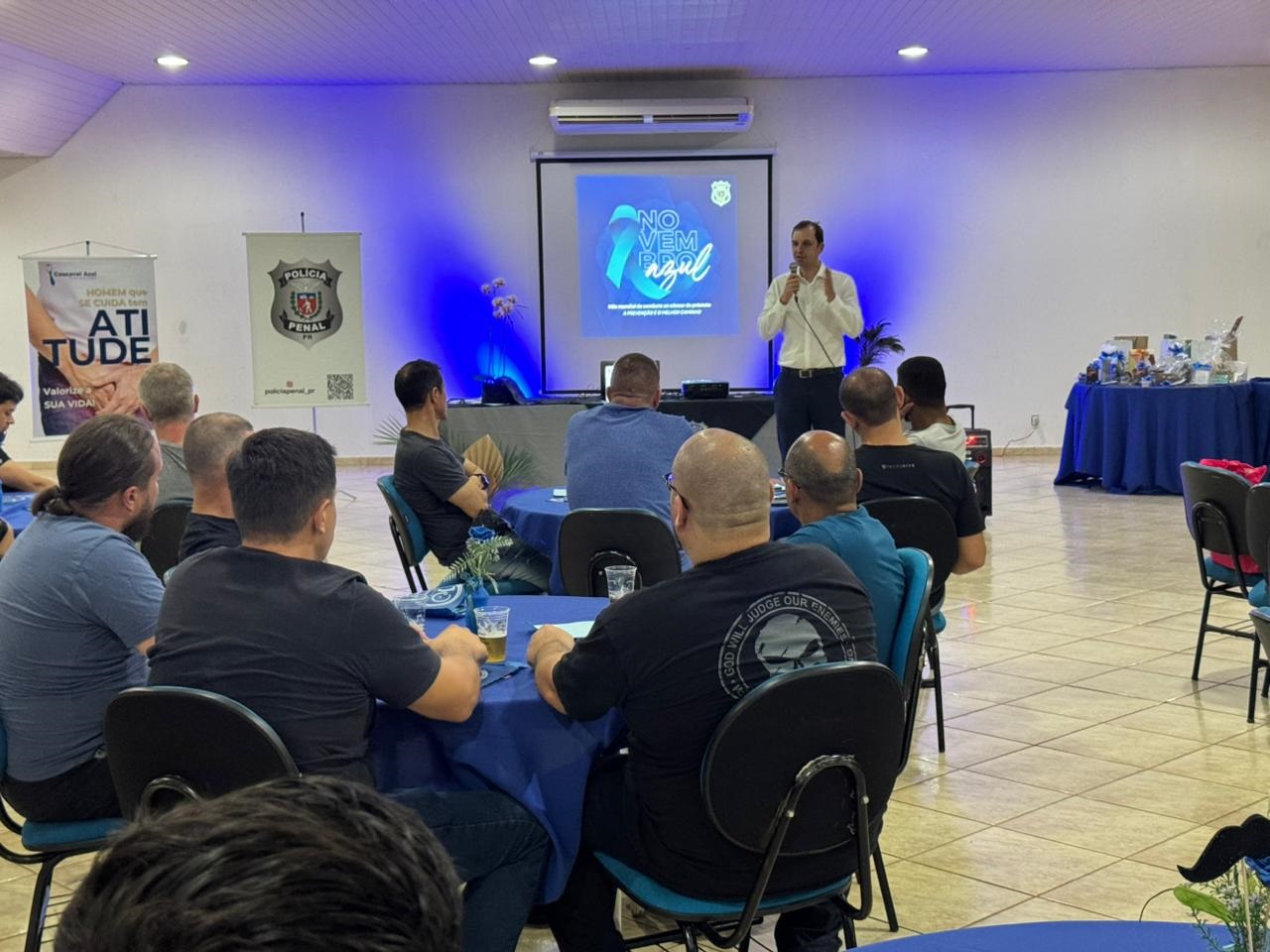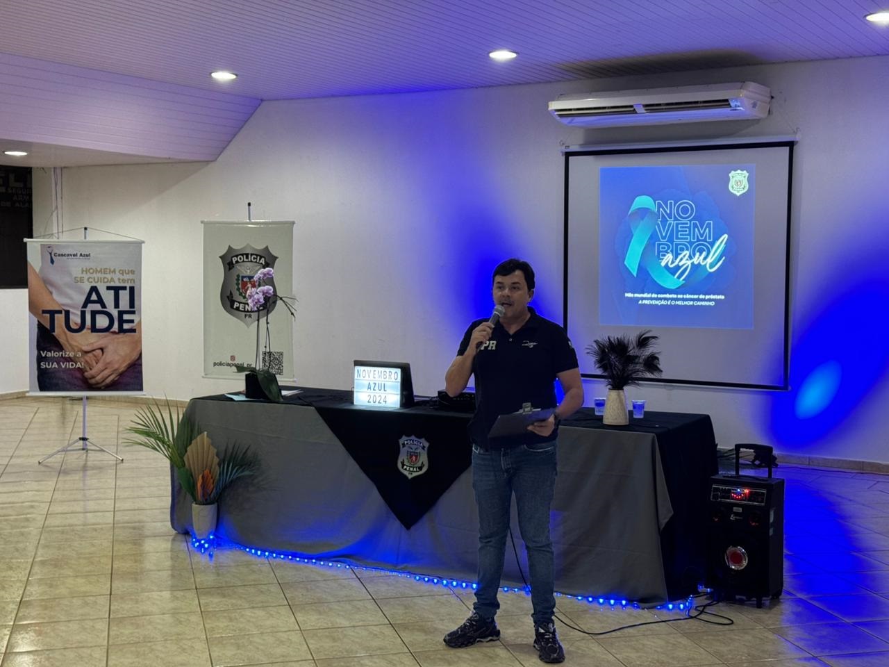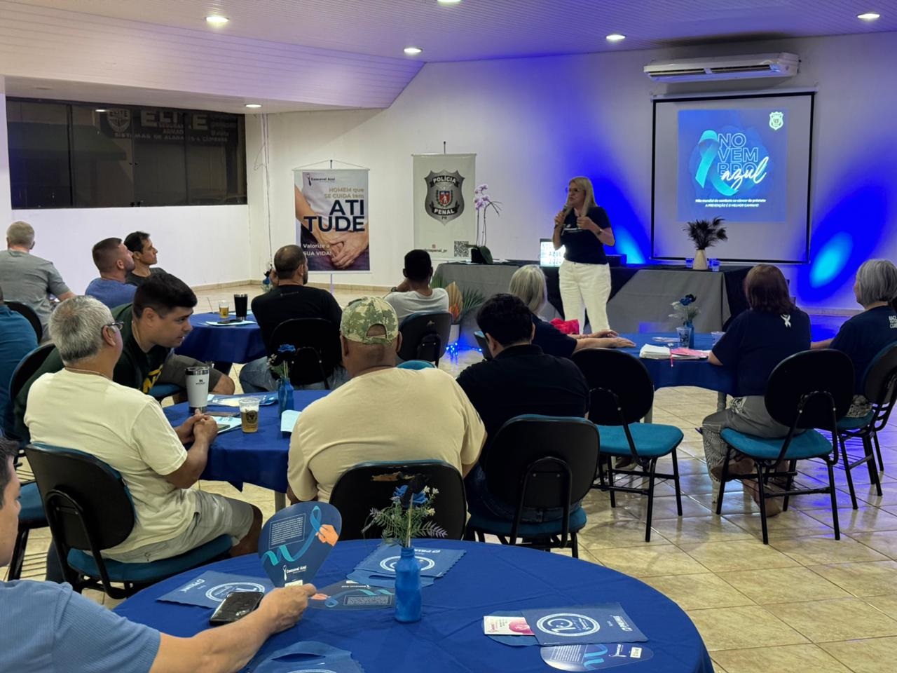 Na noite desta terça-feira (19), a Polícia Penal do Paraná (PPPR) promoveu um evento voltado à conscientização e prevenção do câncer de próstata, reunindo quase 40 pessoas no Salão Verde da Sociedade Rural, em Cascavel. Participaram policiais penais, servidores terceirizados e integrantes ligados ao sistema prisional, em uma ação que reforçou a importância dos cuidados com a saúde masculina.