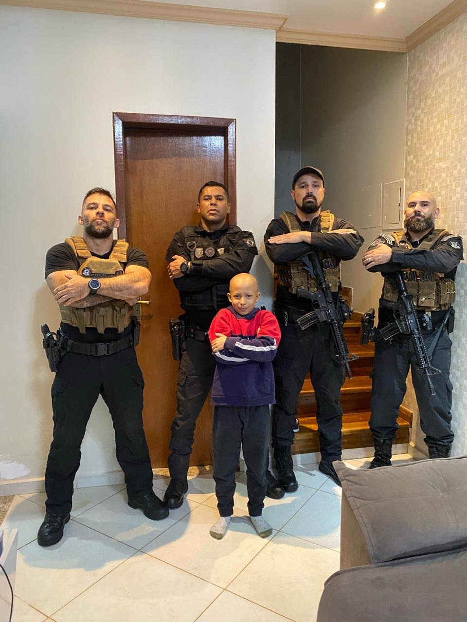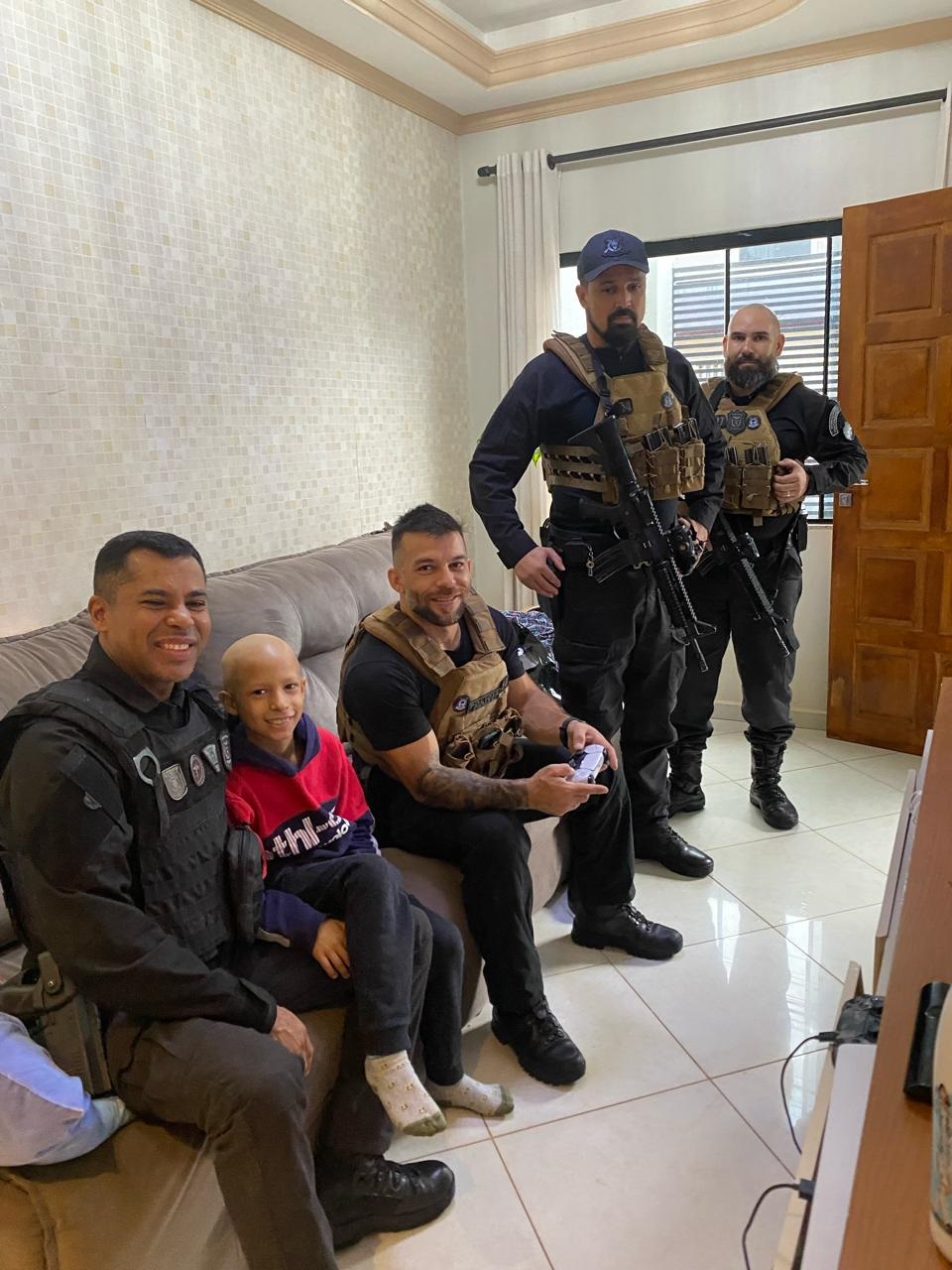 Policiais penais do Setor de Operações Especiais (SOE), da base de Cascavel, no oeste do Paraná, realizaram na tarde de ontem (24) uma surpresa para um menino de nove anos que está em tratamento contra o câncer. A ação aconteceu em sua casa, no Bairro Parque Verde.