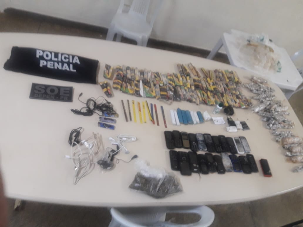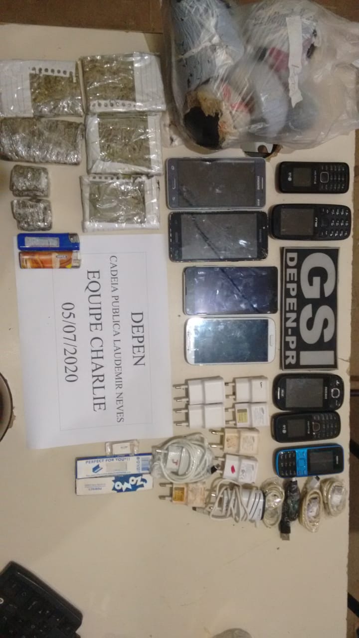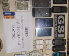 Agentes penitenciários lotados em Foz do Iguaçu aprenderam 30 celulares, 630 gramas de maconha, 60 gramas de cocaína, mais de 1,2 quilos de fumo e diversos invólucros de crack. Os materiais foram encontrados em duas ações, ocorridas nas madrugadas de domingo (05/07) e de segunda-feira (06/07), na Penitenciária Estadual de Foz do Iguaçu II (PEF II) e na Cadeia Pública Laudemir Neves (CPLN).