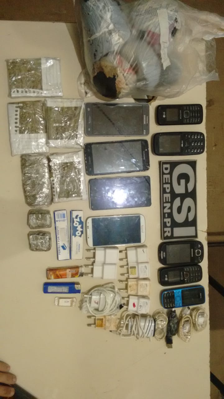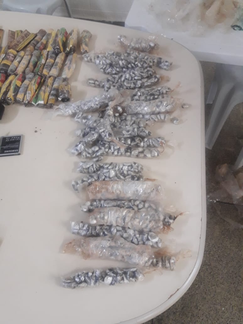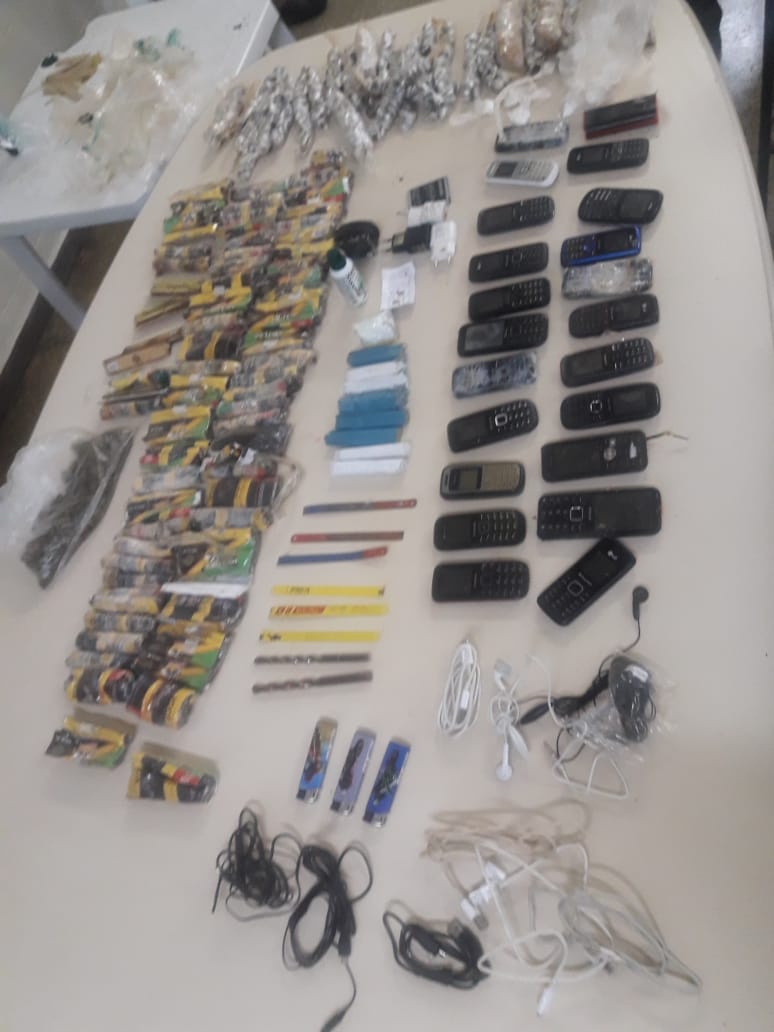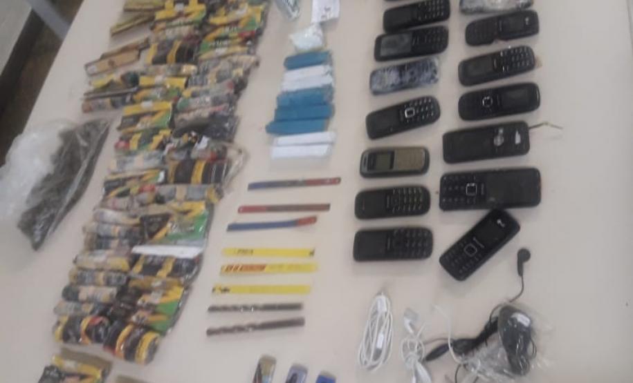 No pacote, além dos celulares e das drogas, continha massa epóxi, tinta verde, oito serras, duas brocas e fumo. Todo o material foi encaminhado à Delegacia da Polícia Civil, para que fossem tomadas as medidas cabíveis.