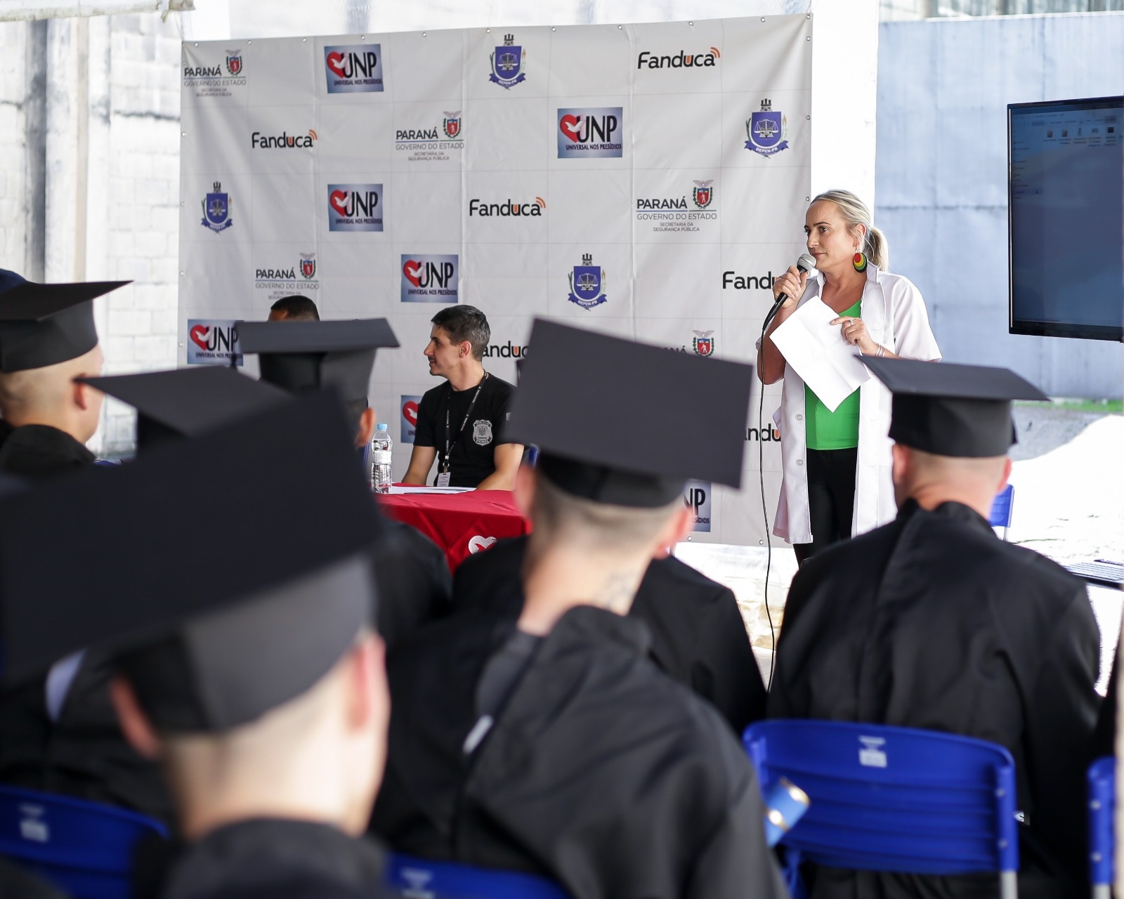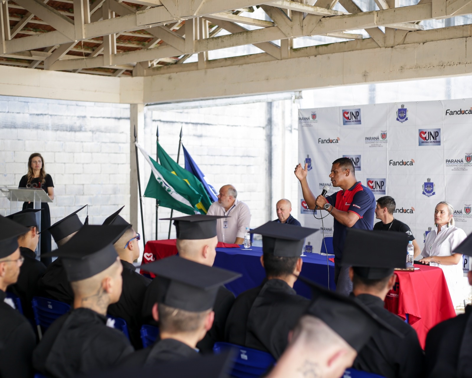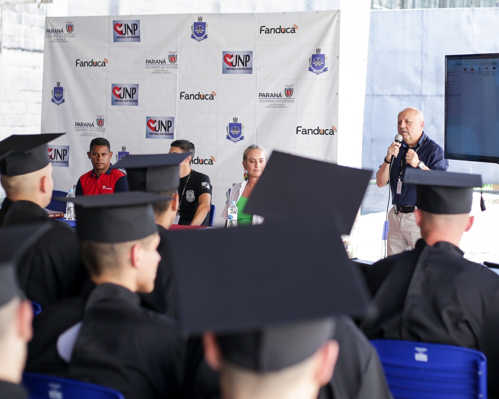 Foi realizada na Penitenciaria Central de Estado – Unidade de Progressão (PCE-UP), na sexta-feira (1º), a formatura dos cursos profissionalizantes, presenciais e EAD, realizados no segundo semestre de 2023, oportunizados aos custodiados através da parceria entre a Polícia Penal do Paraná (PPPR) e a Igreja Universal do Reino de Deus (IURD), com o projeto Universal Nos Presídios (UNP). Na ocasião, 142 pessoas privadas de liberdade (PPL) se formaram nos cursos de Gestão de Empresas, Gestão de Empresas de Transporte, Construção Civil, Auxiliar de Farmácia, Culinária e Barbearia.