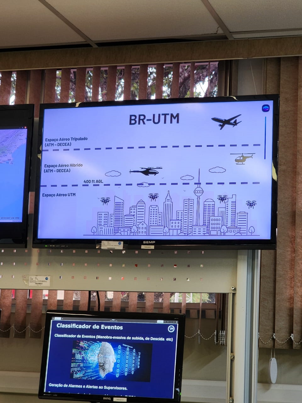 Outro equipamento que chamou bastante a atenção por sua utilidade no âmbito prisional foi um bloqueador de drones, que é composto por duas antenas: uma delas fica ativada de forma constante e localiza a ameaça (o drone) em 360º, identifica o dispositivo, aciona automaticamente a outra antena, que se vira na direção desta ameaça e dispara um feixe direcional para o bloqueio do sinal entre o drone e seu operador, além de criar um “domo”, capaz de bloquear este sinal em uma área de até 3 quilômetros, interrompendo a entrada da aeronave neste espaço. Já nas visitas aos órgãos da Força Aérea Brasileira foi possível conhecer um pouco mais sobre legislação e regulação do uso de drones no espaço aéreo do Brasil.