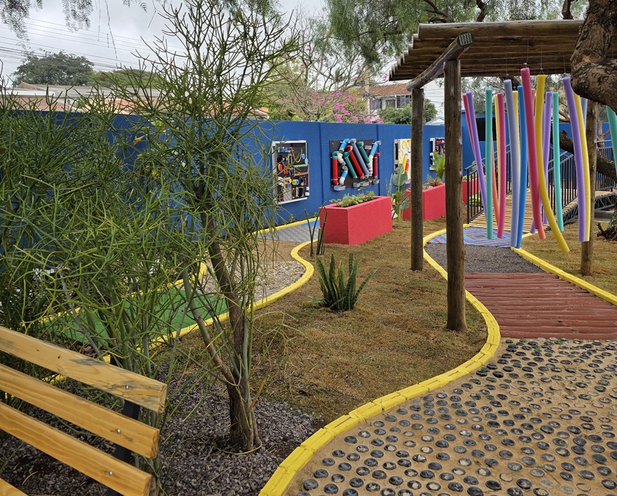 O espaço foi pensado para estimular os cinco sentidos — tato, visão, audição, olfato e paladar — de crianças neurodivergentes, especialmente aquelas com Transtorno do Espectro Autista (TEA). Caminhos com diferentes texturas, áreas com plantas aromáticas, sons da natureza e elementos coloridos fazem parte do ambiente que promove o bem-estar físico e emocional, além de auxiliar no desenvolvimento cognitivo e motor.