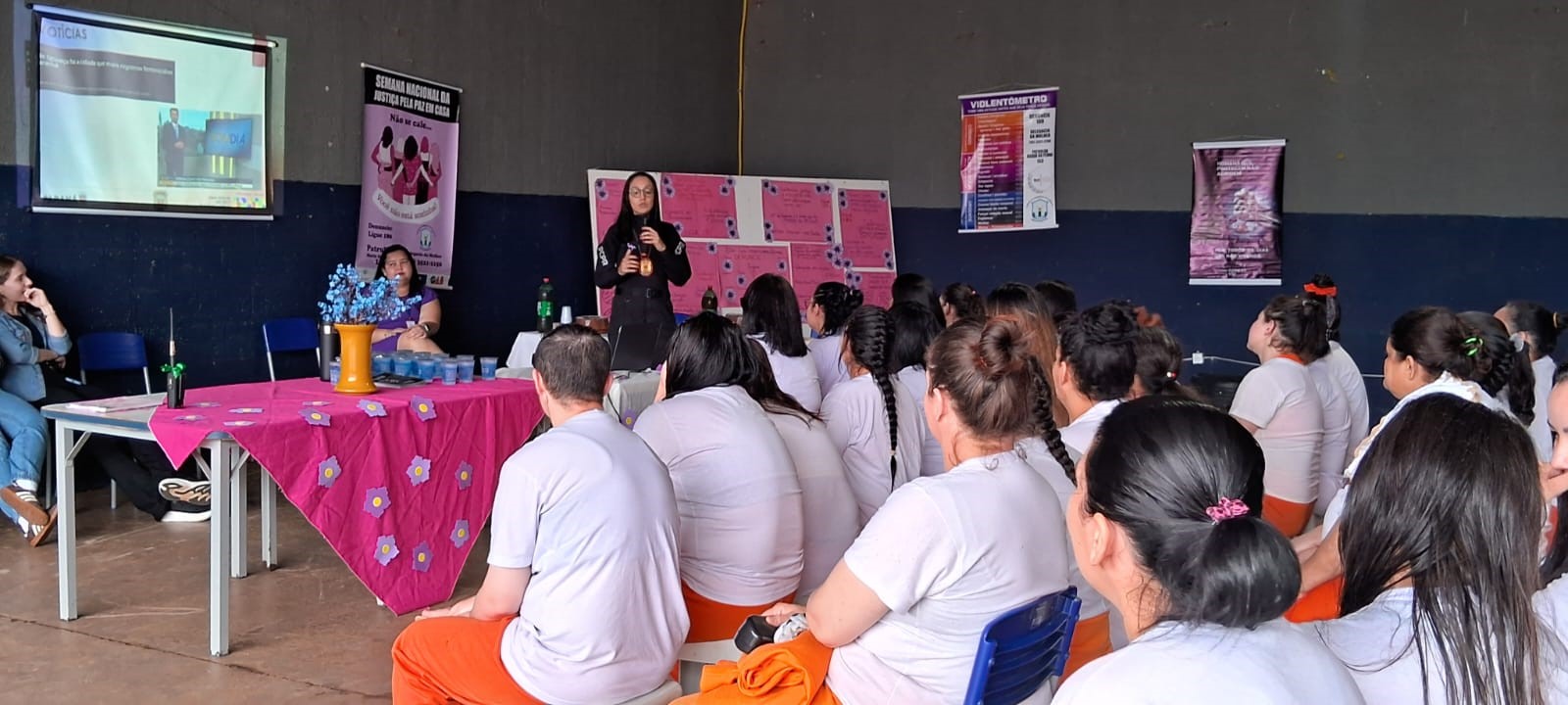 Na tarde desta quinta-feira (21), a Penitenciária Feminina de Foz do Iguaçu – Unidade de Progressão (PFF-UP) promoveu uma palestra especial como parte da campanha Agosto Lilás, dedicada à conscientização e ao combate à violência contra a mulher. A ação contou com a presença da delegada-chefe da Delegacia da Mulher de Foz do Iguaçu, Dra. Giovanna Antonucci, que falou a cerca de 90 internas da unidade sobre os direitos das mulheres, os diversos tipos de violência previstos na Lei Maria da Penha, e as formas de romper com o ciclo da violência.