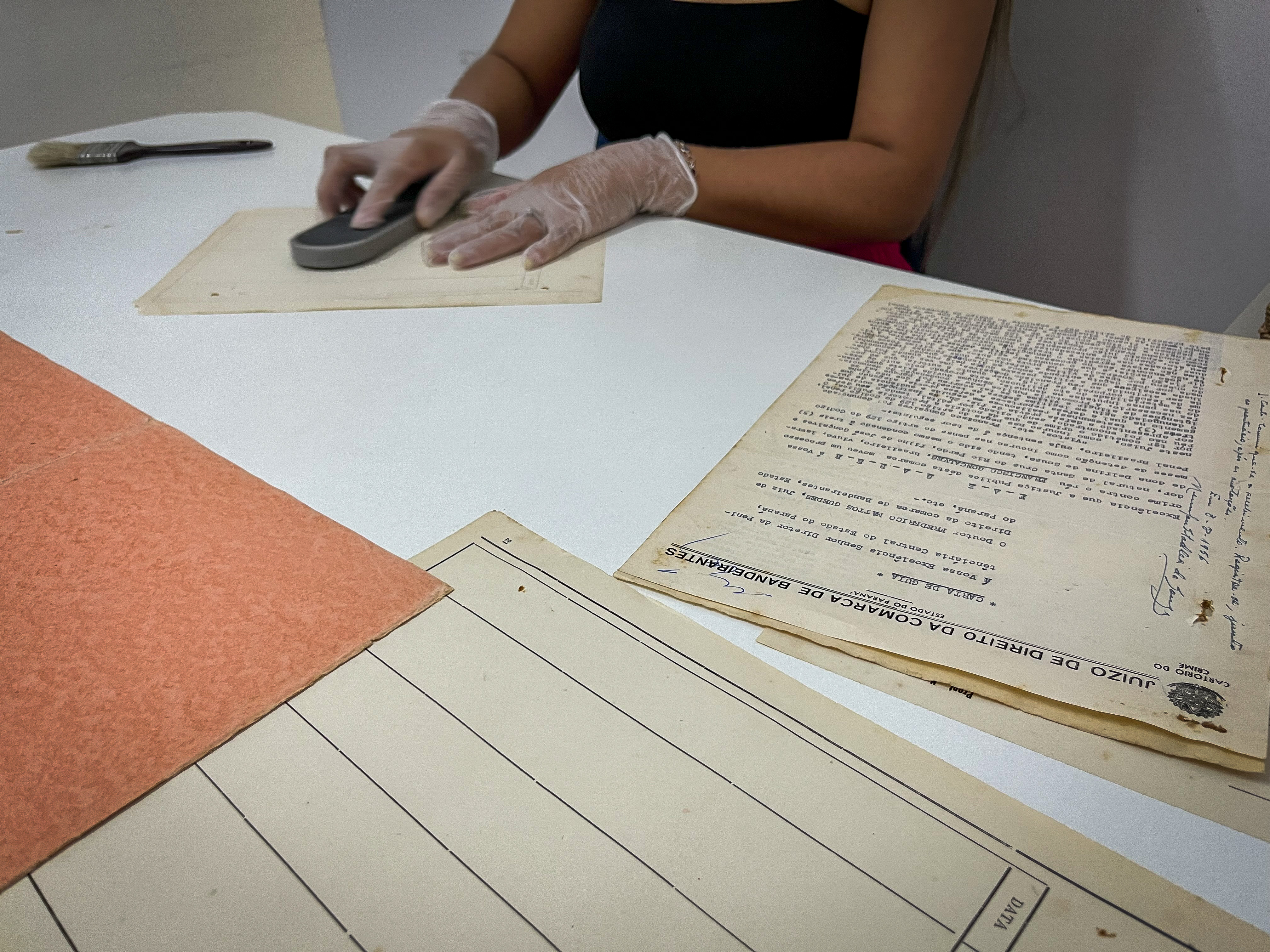 RECUPERAÇÃO DE DOCUMENTOS – A Espen também é responsável pela recuperação de registros documentais do sistema prisional do Paraná. Há quatro anos, foi criado um canteiro de trabalho em que pessoas em monitoração eletrônica realizam o trabalho de higienização e restauração do acervo.