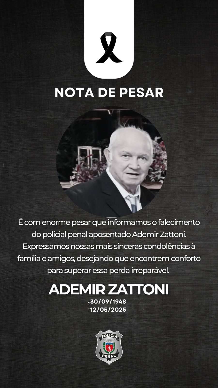 É com pesar que a Polícia Penal do Paraná comunica o falecimento do policial penal aposentado Ademir Zattoni, pai do policial penal Rogério Andreatta Zattoni.