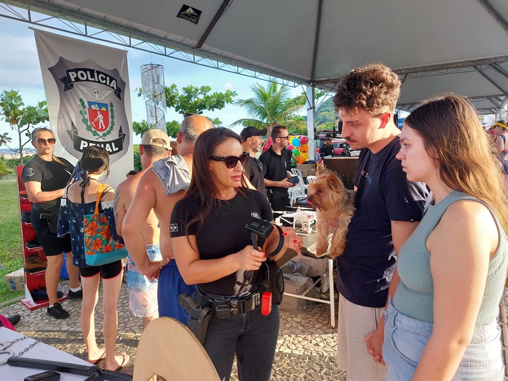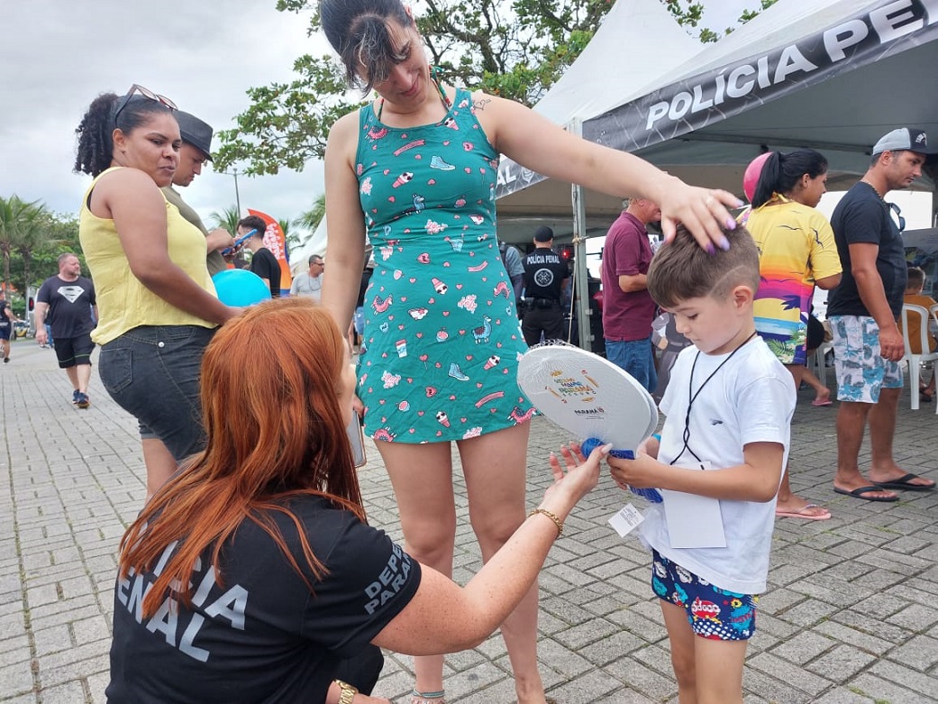 PÉ NA AREIA – Além das exposições, a Polícia Penal também participou da ação "Pé na Areia", organizada pela equipe do Verão Maior Paraná, com o objetivo de levar serviços e entretenimento aos veranistas. A PPPR esteve presente em quatro ações que tiveram uma média de mais de mil visitantes. Nessa atividade, além de expor equipamentos e tecnologias da PPPR, as crianças receberam pulseiras com o nome e telefone dos pais para evitar desaparecimentos na praia. Também houve a distribuição de bonequinhas de fuxico e pelúcias, produzidas nas unidades da regional de Cascavel por meio do Projeto Educar para o Futuro, uma parceria com o Conselho da Comunidade local.