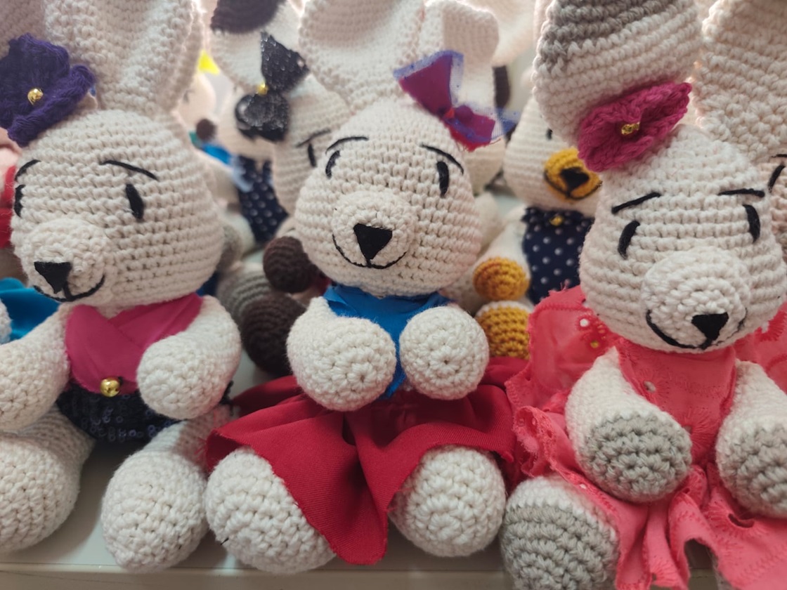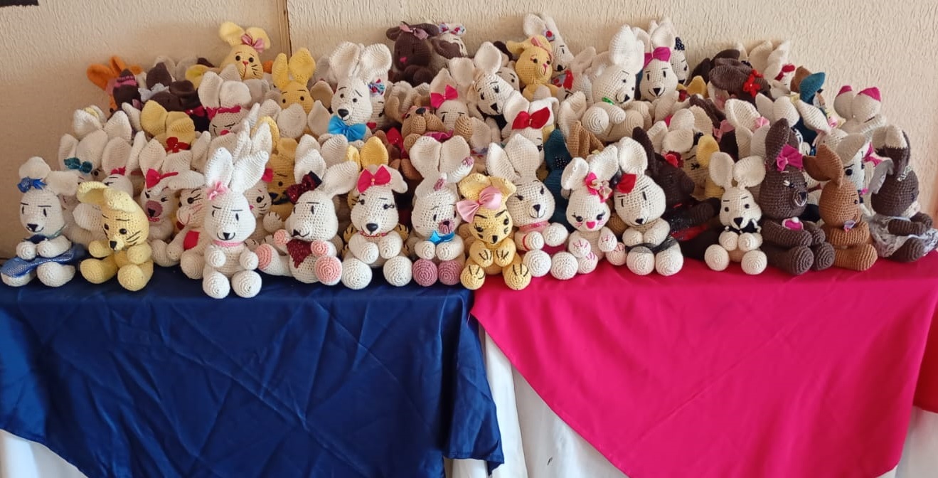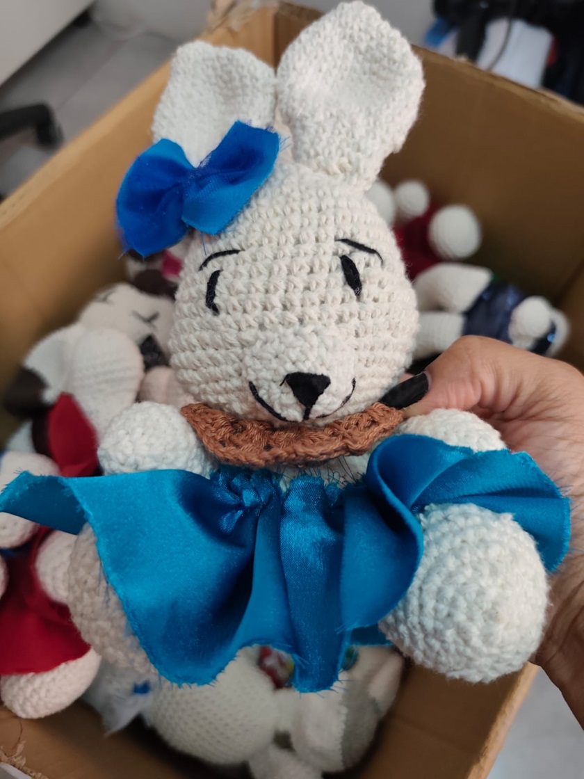 Os coelhos de amigurumi também foram confeccionados pelas internas, com apoio do projeto, responsável pelo custeio dos insumos e materiais utilizados na ação.