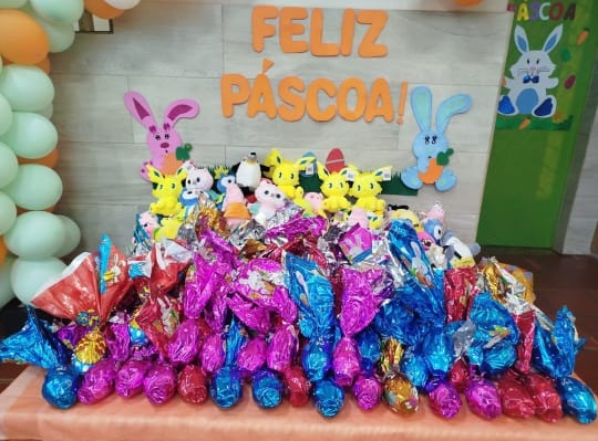 A ação foi realizada no Centro Municipal de Educação Infantil (CMEI) Mãe Maria do Bubas, comunidade atendida pelo projeto. Ao todo, foram distribuídos 700 ovos de chocolate e 500 coelhos de amigurumi às crianças da instituição.