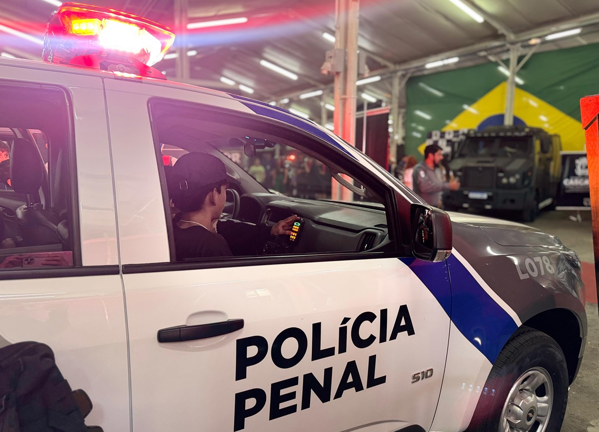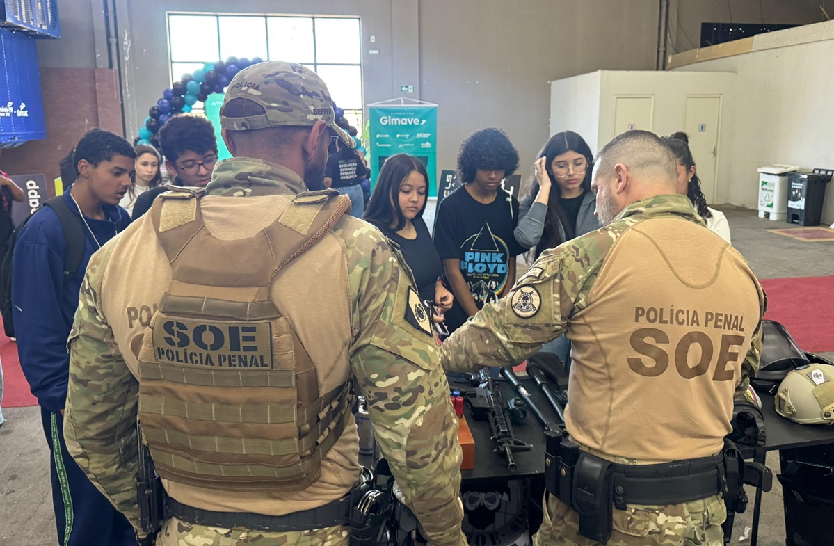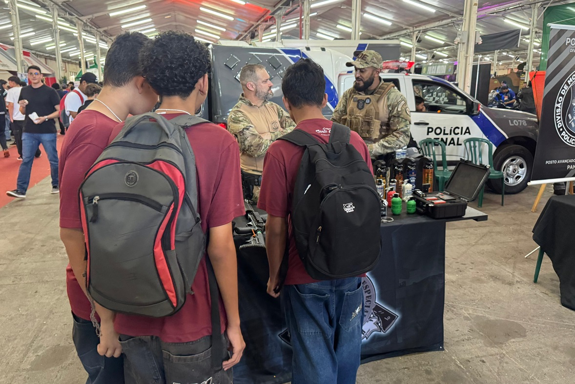 A presença da Polícia Penal no evento também serviu de inspiração para os jovens. O estudante Eduardo Silva, do Ensino Médio, visitou o estande e se impressionou com a carreira: