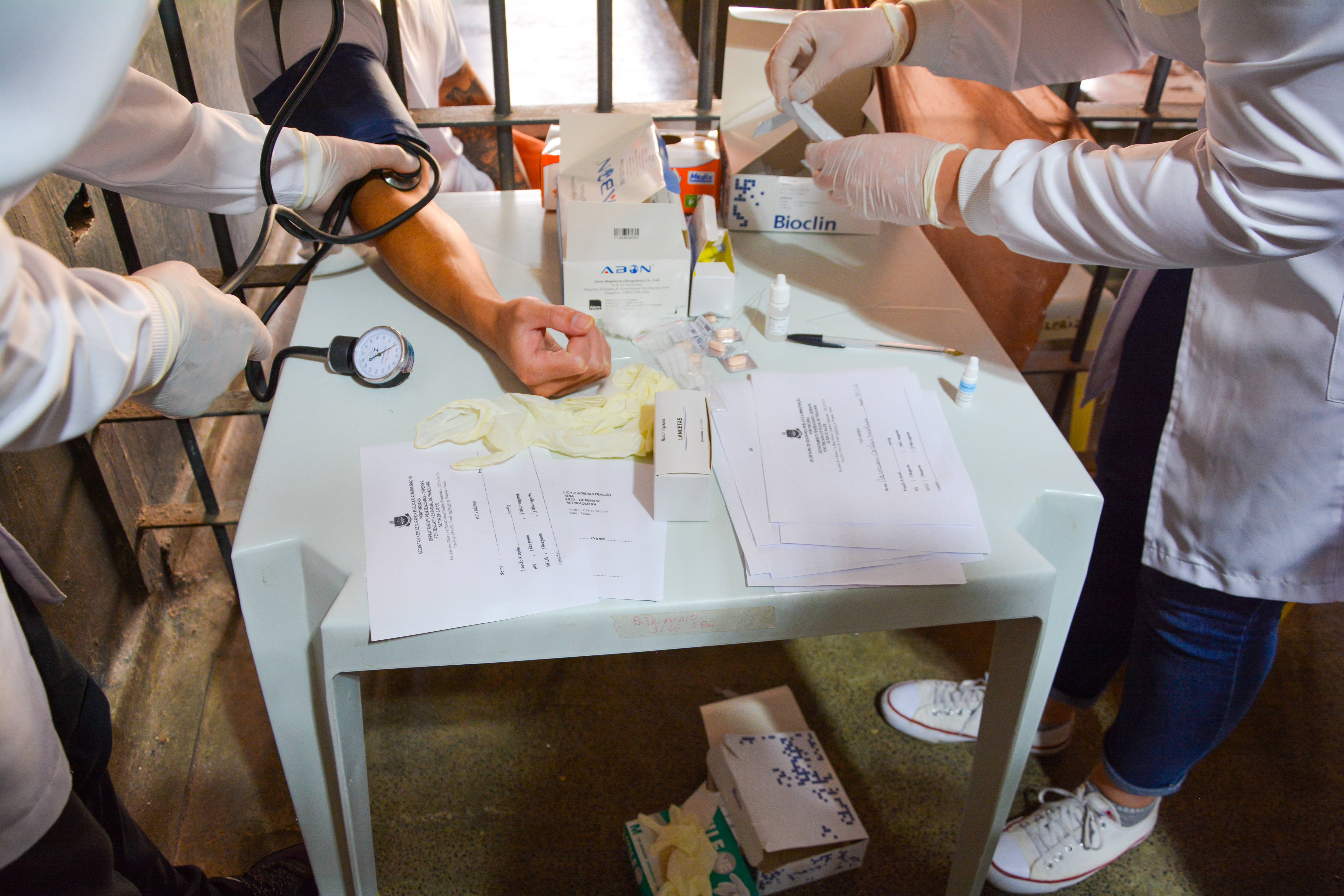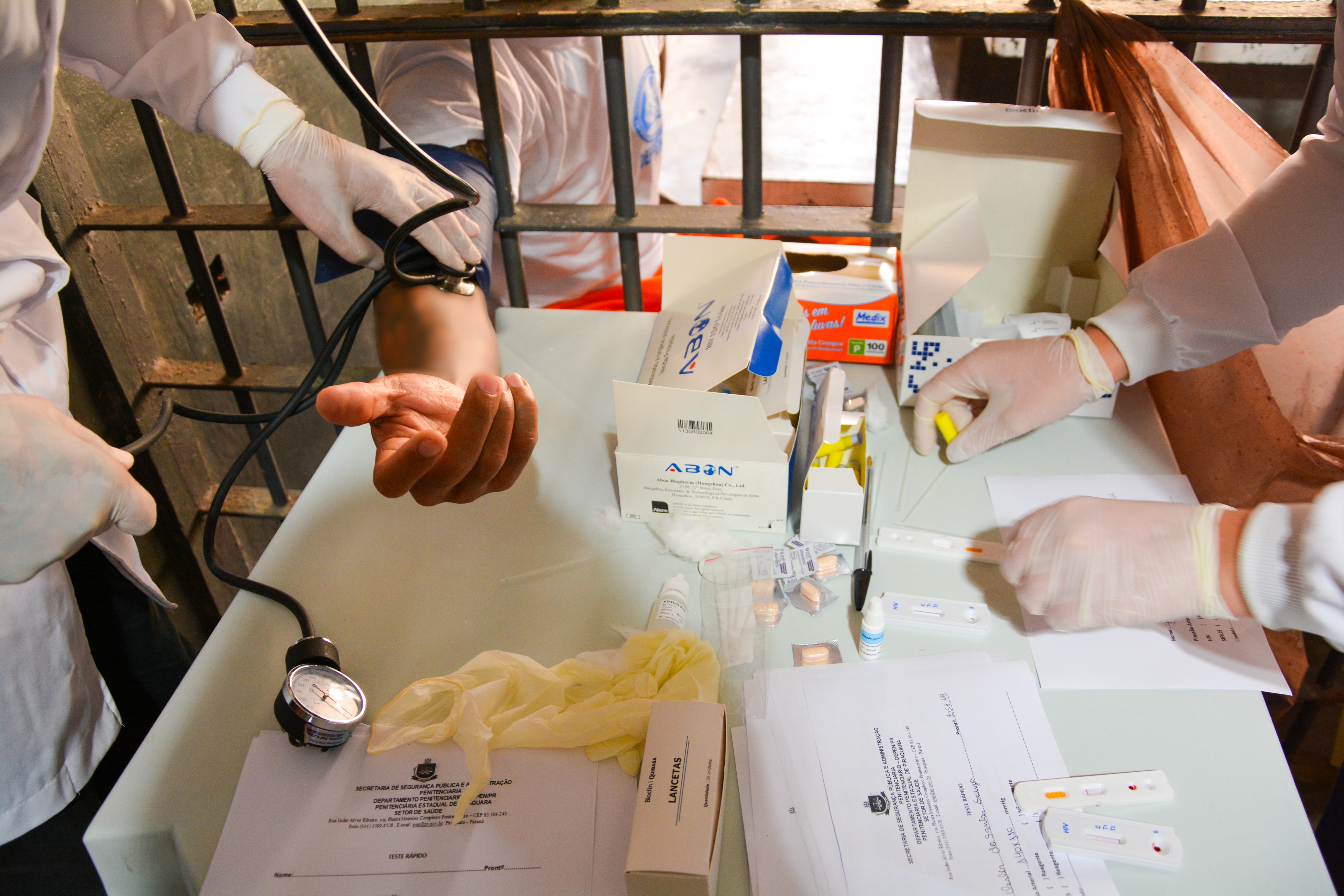 Com apoio dos acadêmicos do curso de Enfermagem, foram realizados testes de HIV, sífilis e aferições de pressão arterial com o objetivo de prevenção e acompanhamento das condições de saúde dos custodiados.