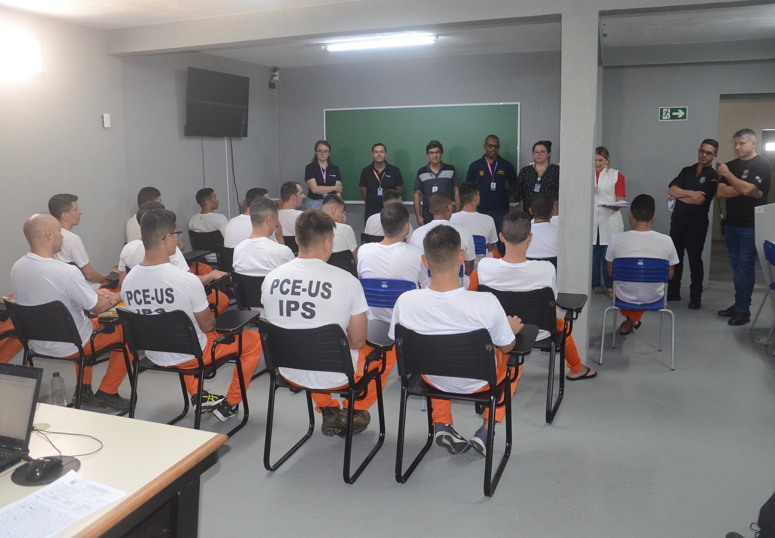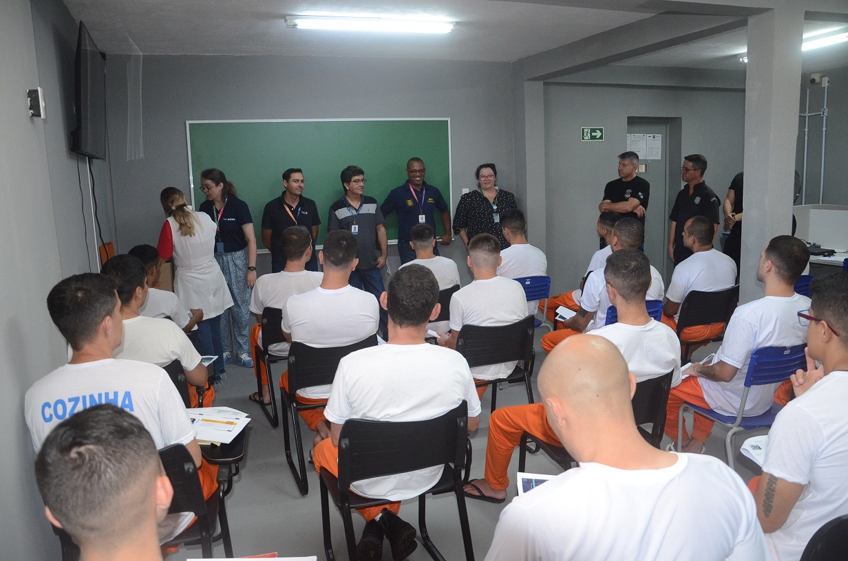Os professores e orientadores pedagógicos do Senai conheceram os espaços disponíveis para as aulas práticas e entregaram aos cursistas jalecos, blocos de anotação, lápis e materiais impressos com as orientações pedagógicas do curso. O Senai é um importante parceiro da Secretaria de Segurança Pública (SESP) e da Polícia Penal do Paraná, ofertando cursos no Sistema Prisional do estado desde 2012, oportunizando às pessoas privadas de liberdade, maiores possibilidades de formação profissional.