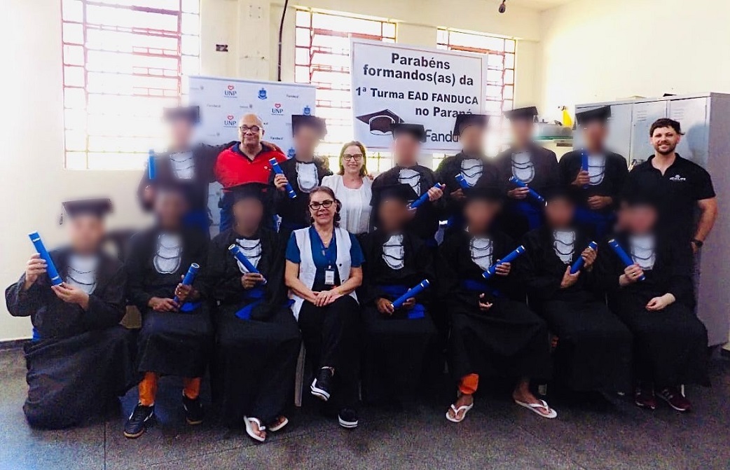 O evento ocorreu nas dependências da unidade. Essa é a primeira turma qualificada na modalidade de Ensino a Distancia (EaD), por meio de um convênio formado pela Faculdade Fanduca, Universal nos Presídios (UNP) e Polícia Penal do Estado do Paraná, órgão de execução vinculado à Secretaria Estadual de Segurança Pública (SESP/PR).
