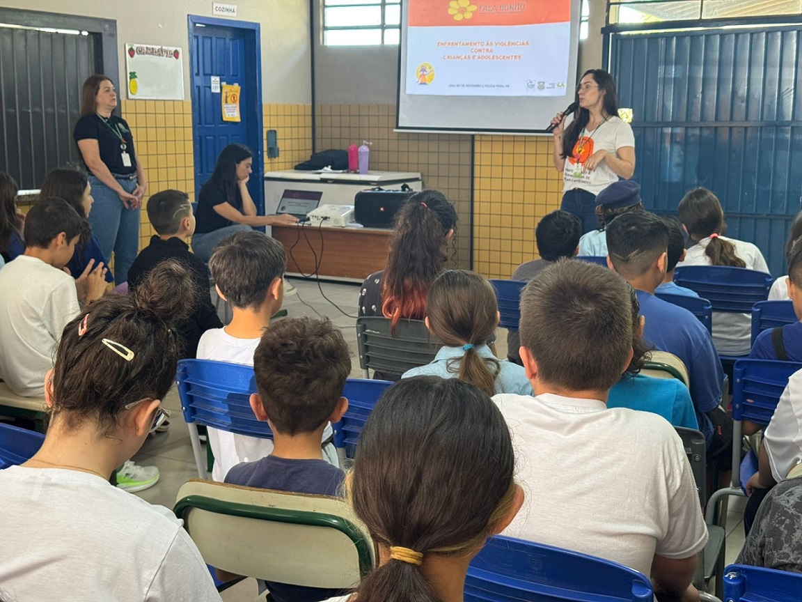 Nesta quarta-feira (14), a Polícia Penal do Paraná (PPPR) participou de uma ação educativa e preventiva no Colégio Estadual Cívico Militar XIV de Novembro, em Cascavel, promovida pelo Centro de Referência de Assistência Social (CRAS) do bairro XIV de Novembro. A atividade faz parte das ações do Maio Laranja, mês de conscientização e combate ao abuso e à exploração sexual de crianças e adolescentes no Brasil.
