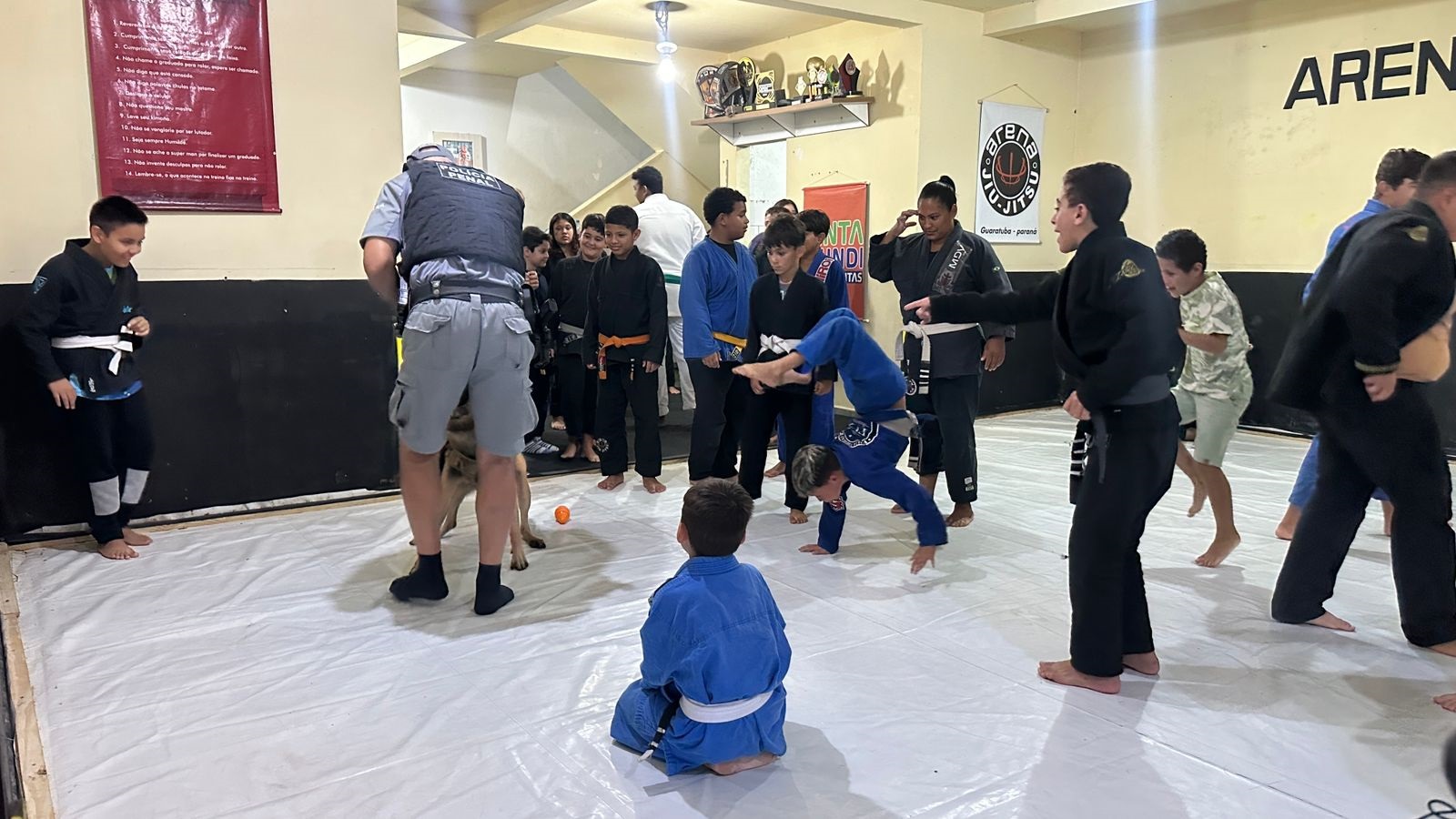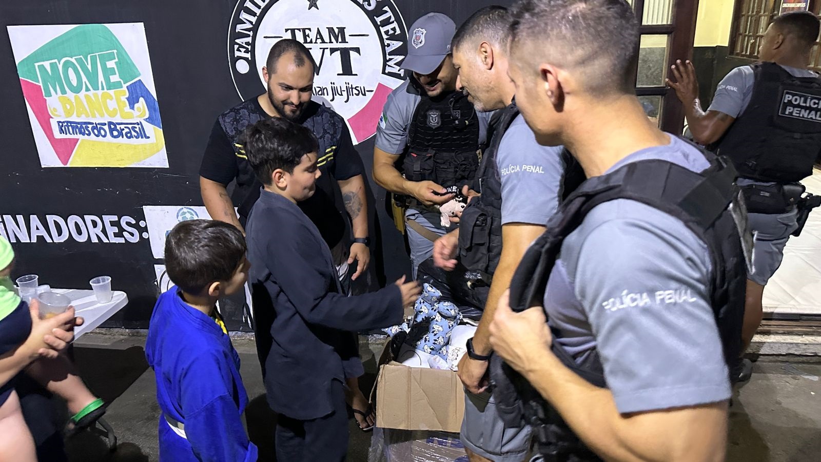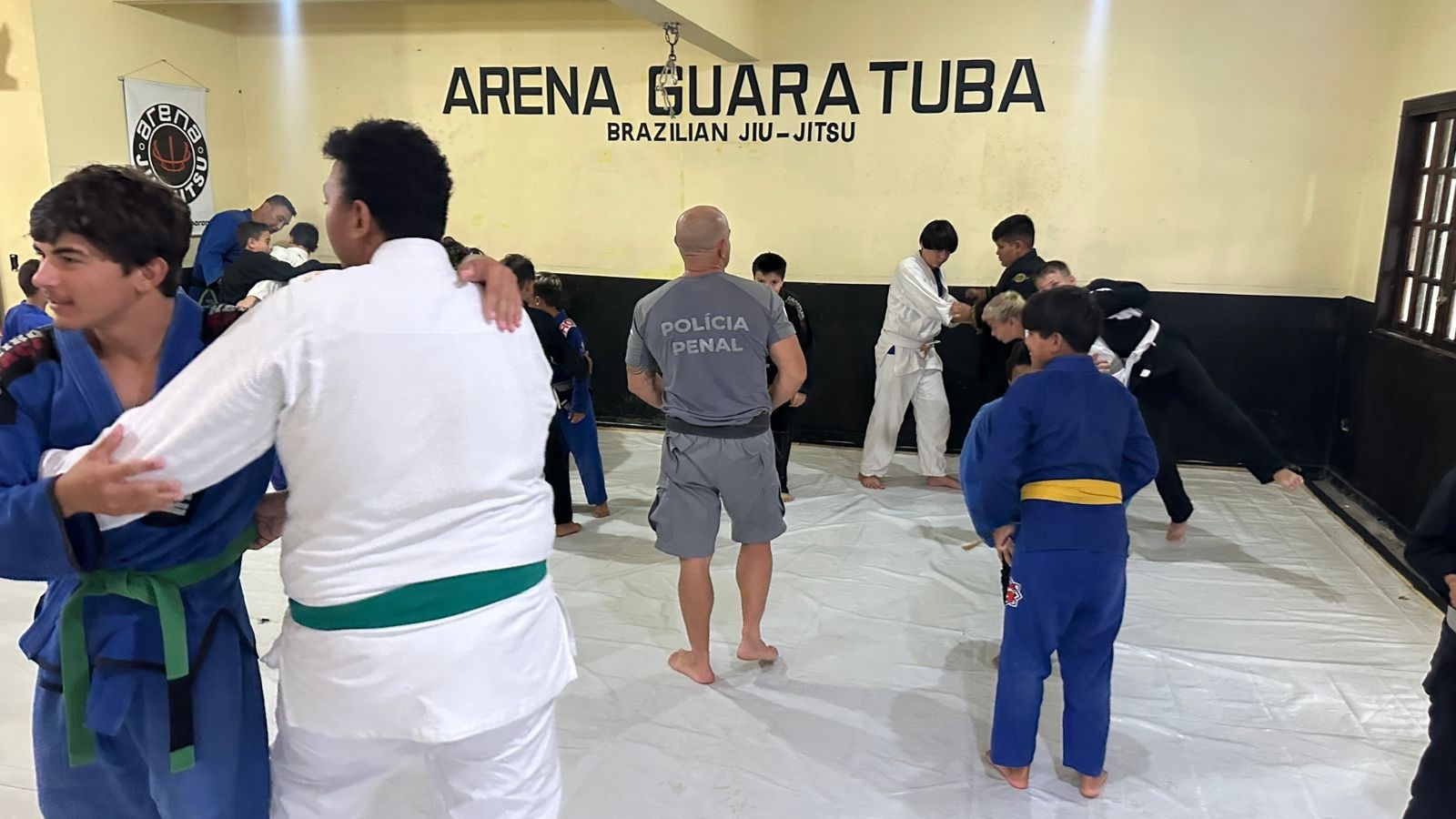 Durante ações da operação Verão Maior Paraná, a Polícia Penal do Paraná (PPPR) realizou uma ação social com crianças e adolescentes carentes que praticam jiu-jitsu e muay thai dentro do projeto social “Construindo Campeões”, desenvolvido na cidade de Guaratuba, no litoral do estado. Durante o evento, os alunos do projeto puderam ter uma aula diferente, aprendendo técnicas de arte marcial com um policial penal lotado na regional administrativa de Ponta Grossa e que também é instrutor de jiu-jitsu, além de interagir com os cães da unidade K9 e conhecer drones utilizados nas operações da PPPR. Também foi realizada uma distribuição de brindes e uma confraternização com um lanche especial.