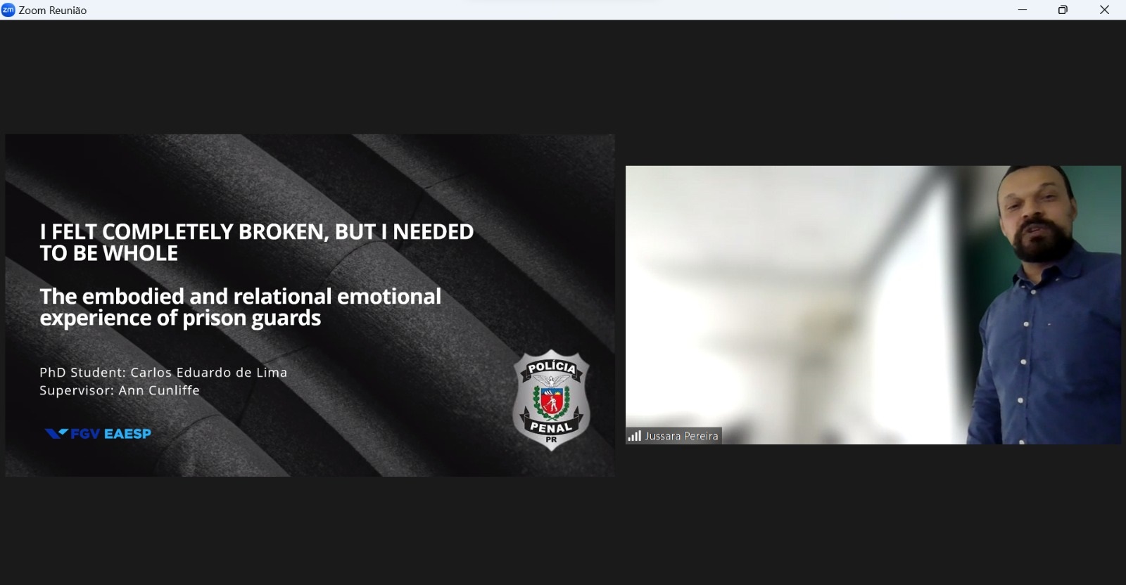 Na tarde desta quarta-feira (13), o policial penal Carlos Eduardo de Lima defendeu sua tese de doutorado em administração de empresas pela Fundação Getúlio Vargas (FGV), em São Paulo. A dissertação com o título “Eu me senti em pedaços mas precisava estar inteiro: as experiências emocionais dos policiais penais” utilizou o sistema prisional e os policiais penais do Paraná como pano de fundo para a tese. Ele fez entrevistas anônimas e um trabalho de observação para entender a dinâmica das emoções que emergem dos colegas de trabalho e como os trabalhadores lidam com isso.