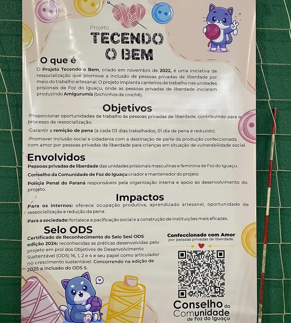 Os trabalhos expostos fazem parte do projeto Tecendo o Bem, uma iniciativa de reinserção social que há 3 anos proporciona aos internos das unidades prisionais de Foz do Iguaçu a oportunidade de aprender e criar, por meio do trabalho artesanal, a confecção de amigurumis. O projeto foi reconhecido pelo Selo Sesi ODS, sendo um exemplo de colaboração entre a comunidade e a PPPR, trazendo impactos positivos dentro e fora dos presídios.
