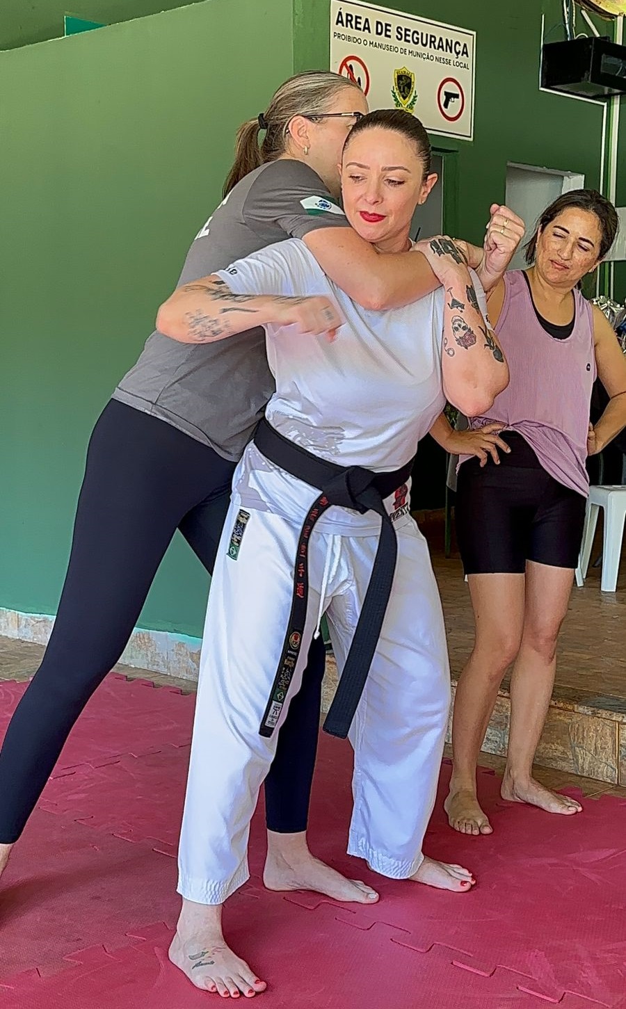 Durante a atividade, foram apresentadas técnicas de imobilização, postura preventiva, consciência situacional e estratégias de autoproteção aplicáveis tanto ao ambiente de trabalho quanto à vida cotidiana.