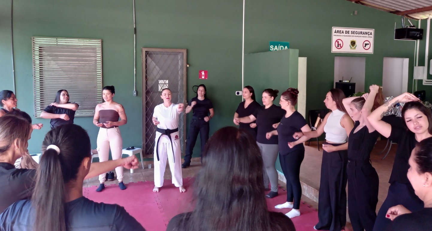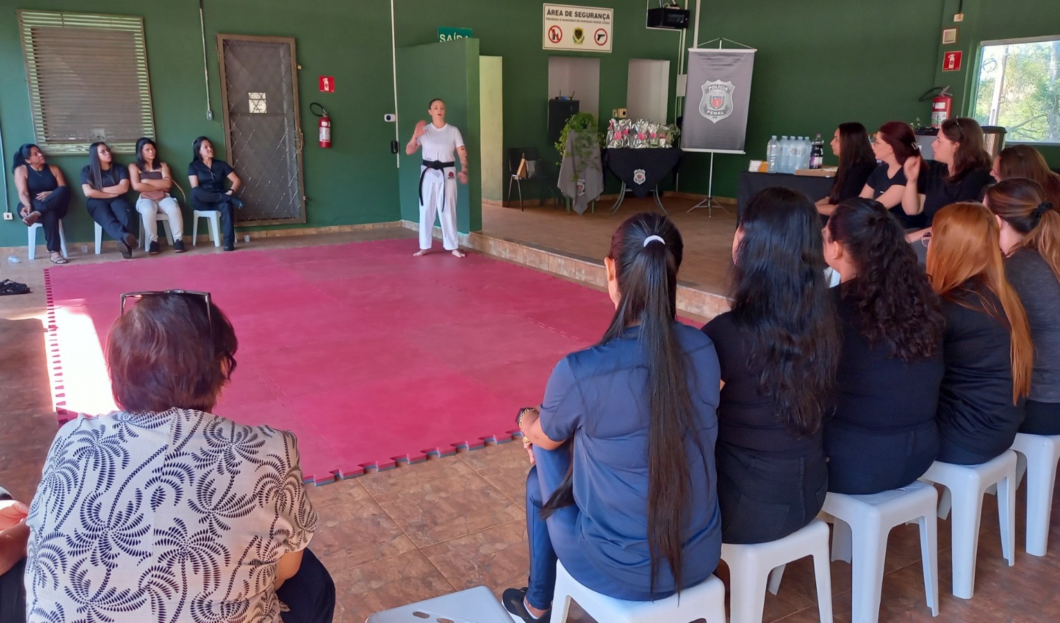 Um dos destaques da programação foi a aula de defesa pessoal ministrada por Gabriela Marcante, servidora da Guarda Civil Municipal de Maringá (GCM), faixa preta em karatê e instrutora da Escola de Formação da corporação. A profissional já atuou no sistema prisional de Cascavel, por meio de Processo Seletivo Simplificado e como colaboradora terceirizada, acumulando mais de uma década de experiência na área.
