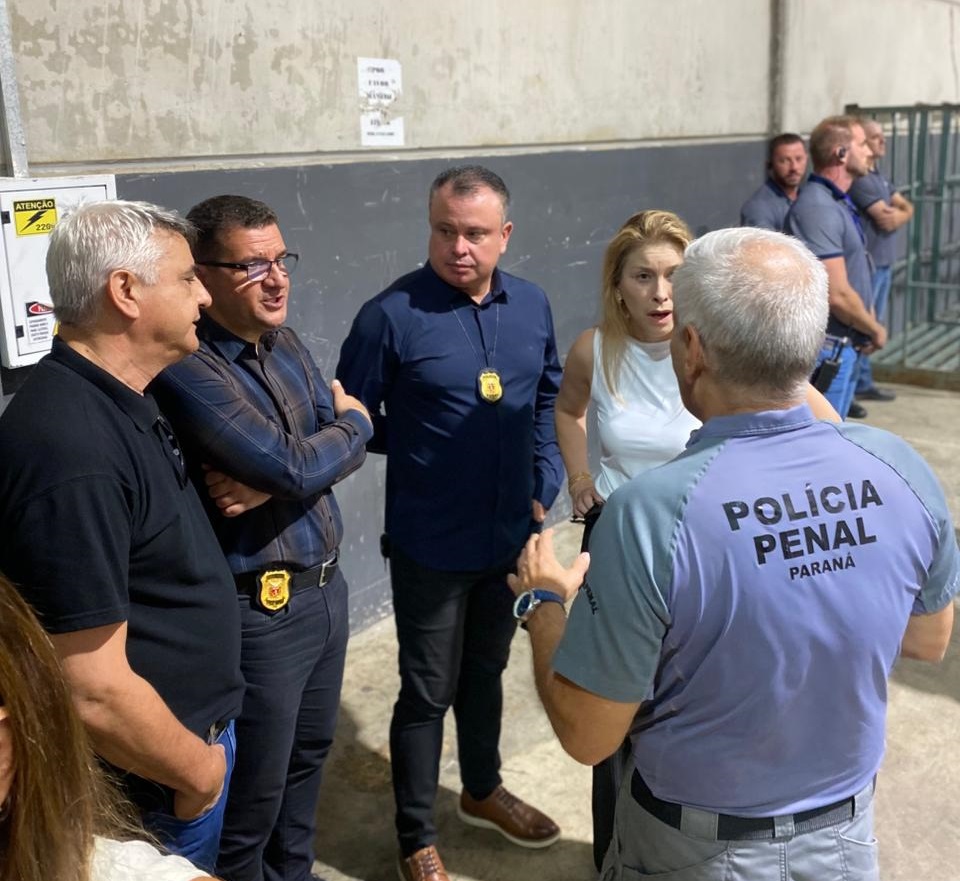 Nesta terça-feira (31), a Penitenciária Estadual de Francisco Beltrão (PEFB), no sudoeste do Paraná, recebeu a visita técnica de uma comitiva formada por representantes da Secretaria Nacional de Políticas Penais (Senappen), do setor do fundo penitenciário, de unidades penais federais, além da juíza da Vara de Execuções Penais (VEP) de Coroatá (MA), Anelise Nogueira Reginato, e integrantes da Divisão de Produção e Desenvolvimento da Polícia Penal do Paraná (PPPR).