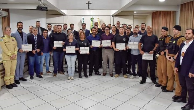 PRESENÇA – Na solenidade, esteve presente o prefeito Cleber Fontana, além de representantes das demais forças de segurança: Capitão Anderson Frossad, da Polícia Militar, Capitã Débora Kolossoskei, do Corpo de Bombeiros e Delegado José Pacheco, da Polícia Civil. Além disso, o Coordenador Regional do Departamento de Polícia Penal, Marcos Andrade, que foi um dos homenageados.
