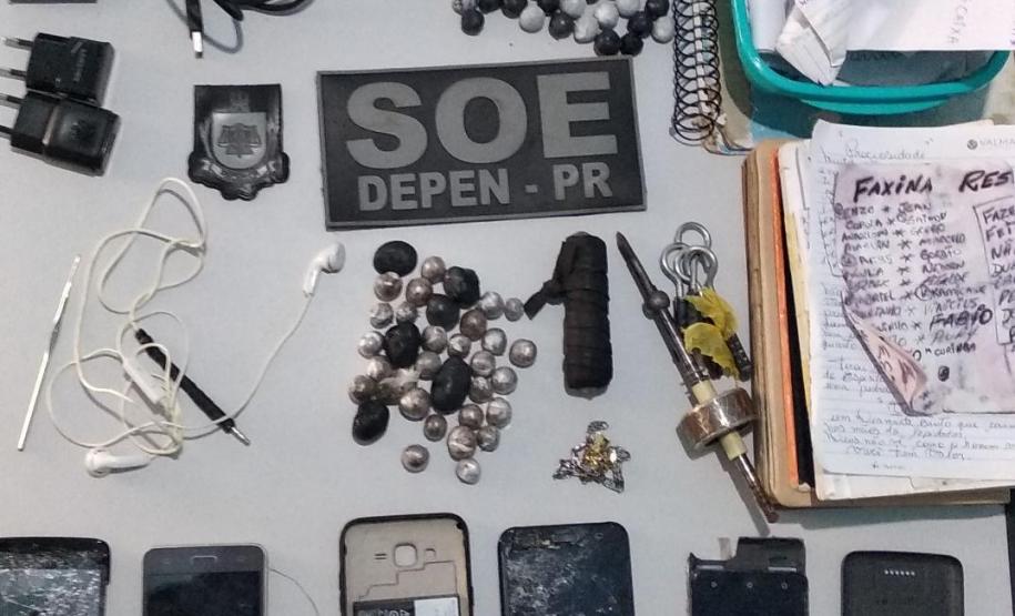 Durante as buscas, os agentes encontraram cinco celulares, quatro carregadores, 35 porções de maconha, além de pequenos tabletes que totalizaram 65 gramas da mesma droga. Fumo, uma ferramenta artesanal usada para fazer buracos nas paredes e diversas anotações do crime organizado também foram apreendidos pelas equipes. As apreensões foram encaminhadas à Polícia Civil, onde o caso foi registrado.